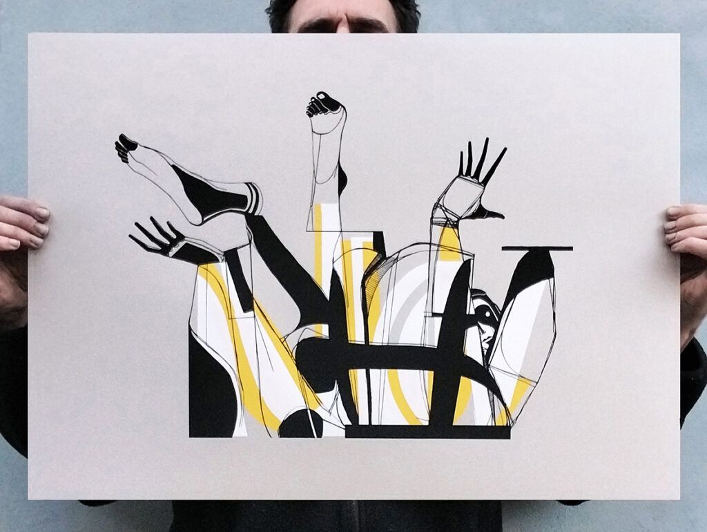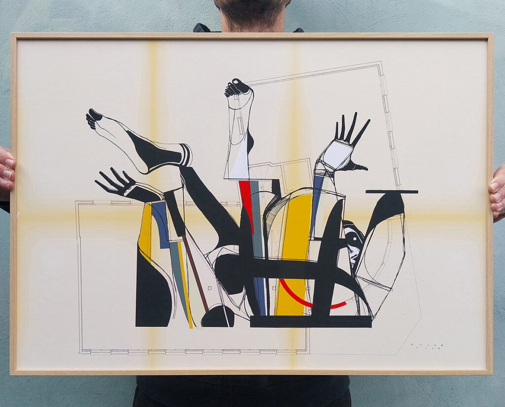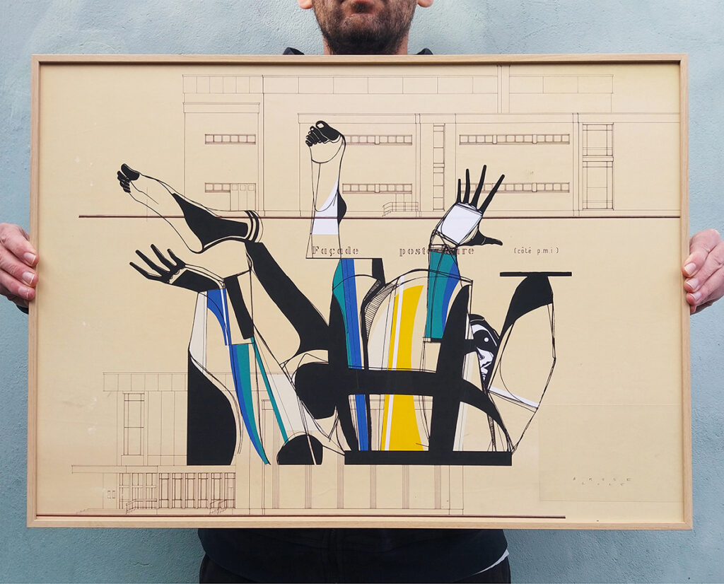 Ink, acrylic and collage on old architectural plan / 50 x 70 cm.